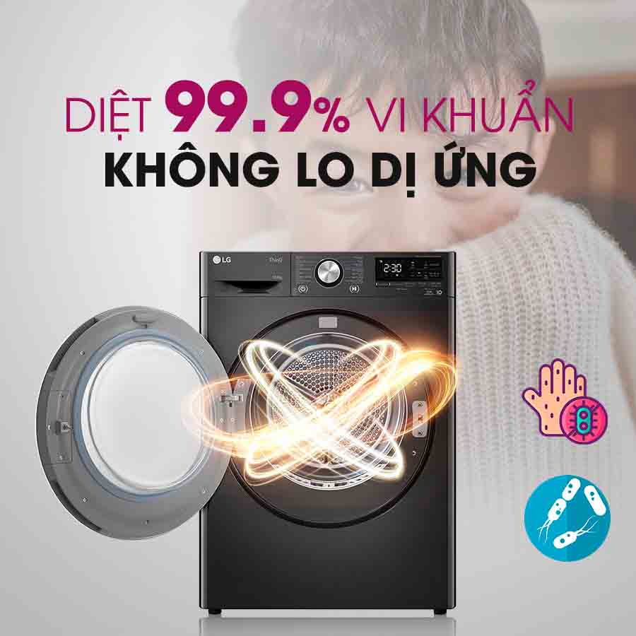 Máy sấy LG được thiết kế với chu trình Chăm sóc dị ứng, giúp tiêu diệt 99,9% vi khuẩn và mạt bụi còn sống có hại trên quần áo và đồ dùng cá nhân. Điều này giúp cho quần áo, đồ dùng cá nhân của bạn luôn sạch sẽ và an toàn cho sức khỏe của cả gia đình.