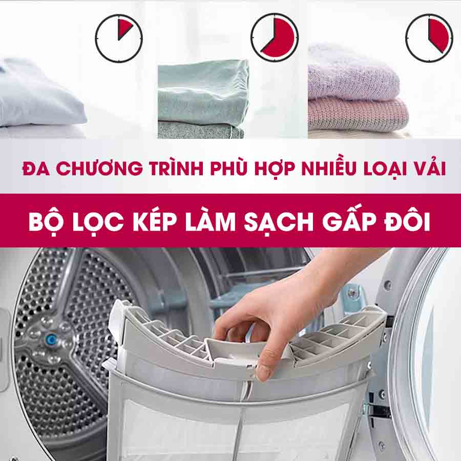 Bộ lọc kép được LG trang bị có khả năng giảm thiểu xơ vải và bụi bẩn, đến mức tóc cũng không thể lọt qua. Tính năng cho phép luồng không khí được lọc qua hai lớp lọc khác nhau để đảm bảo loại bỏ tối đa bụi và tạp chất trong quá trình sấy.