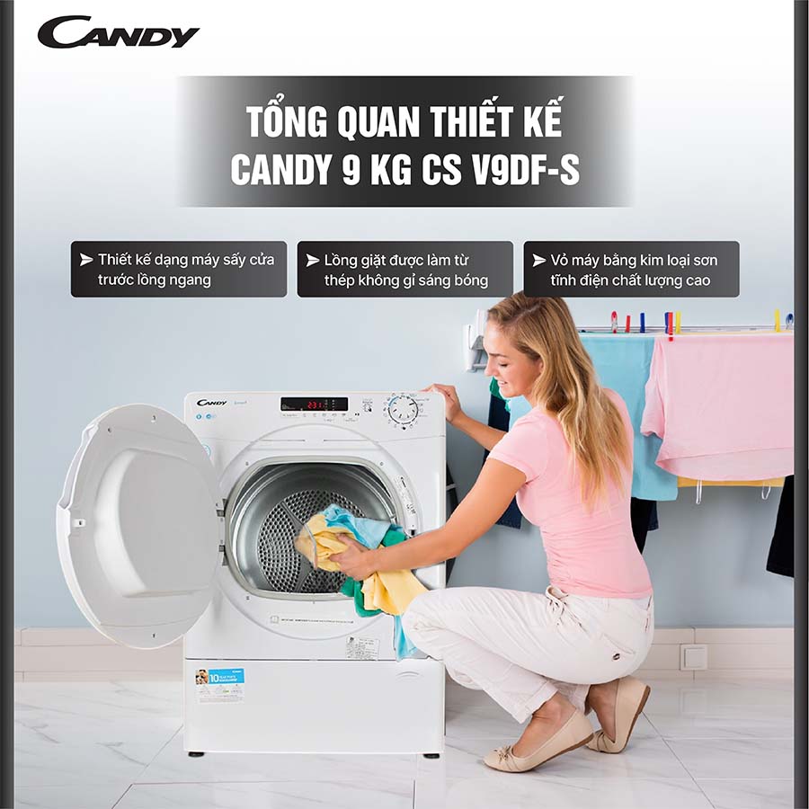 Ngoài ra, vị trí lắp đặt hợp lý còn giúp giữ cho không gian xung quanh máy luôn khô ráo, sạch sẽ, ngăn ngừa mùi hôi và các vấn đề liên quan đến độ ẩm cao như nấm mốc hay vi khuẩn phát triển. Nhờ vậy, máy sấy Candy CS V9DF-S không chỉ mang lại hiệu quả sấy tốt mà còn góp phần bảo vệ sức khỏe và nâng cao chất lượng cuộc sống cho người sử dụng.