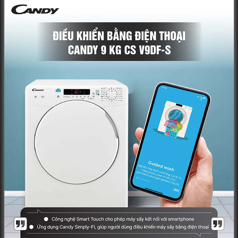 Máy sấy Candy CS V9DF-S được trang bị tính năng điều khiển thông minh qua điện thoại smartphone, tích hợp công nghệ NFC hiện đại. Nhờ khả năng kết nối nhanh chóng và ổn định với ứng dụng Candy Simply-Fi, người dùng có thể dễ dàng quản lý và vận hành máy sấy mọi lúc mọi nơi chỉ bằng vài thao tác trên điện thoại.
