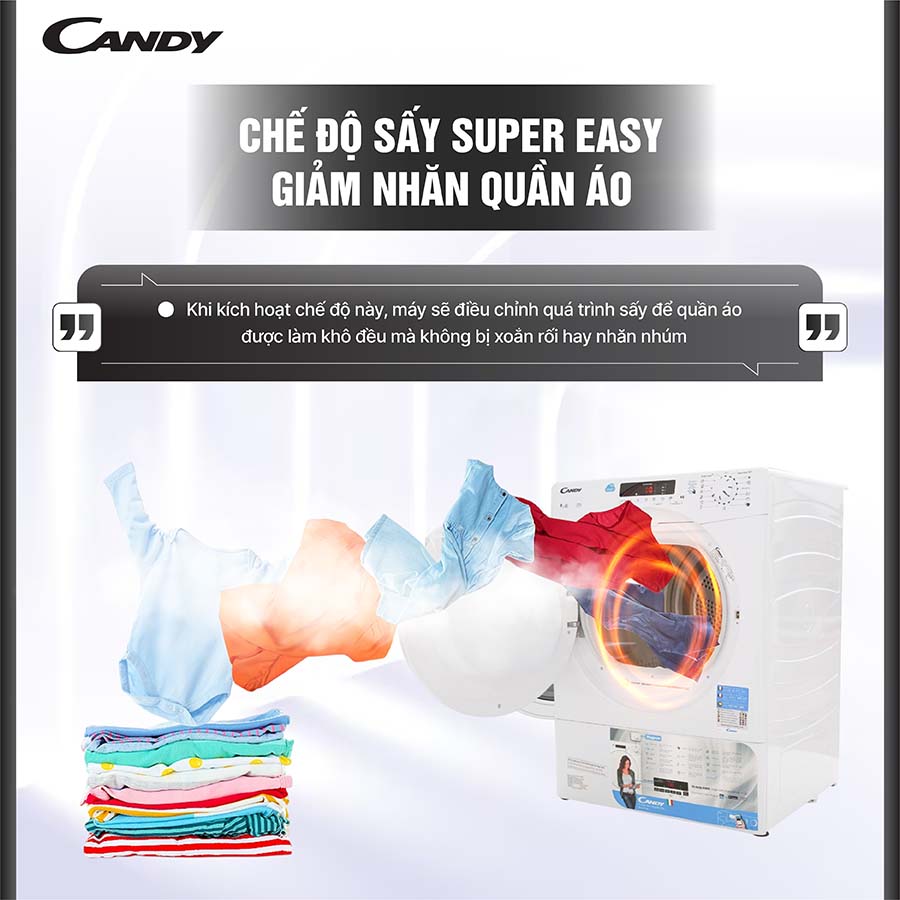 Chế độ sấy Super Easy trên máy sấy Candy CS V9DF-S là một tính năng nổi bật giúp giảm thiểu nếp nhăn trên quần áo một cách hiệu quả. Khi kích hoạt chế độ này, máy sẽ điều chỉnh quá trình sấy để quần áo được làm khô đều mà không bị xoắn rối hay nhăn nhúm, từ đó giúp người dùng tiết kiệm tối đa thời gian và công sức khi là ủi sau này.