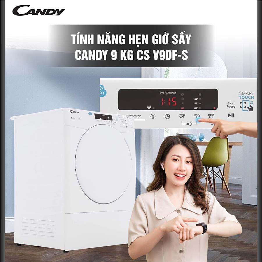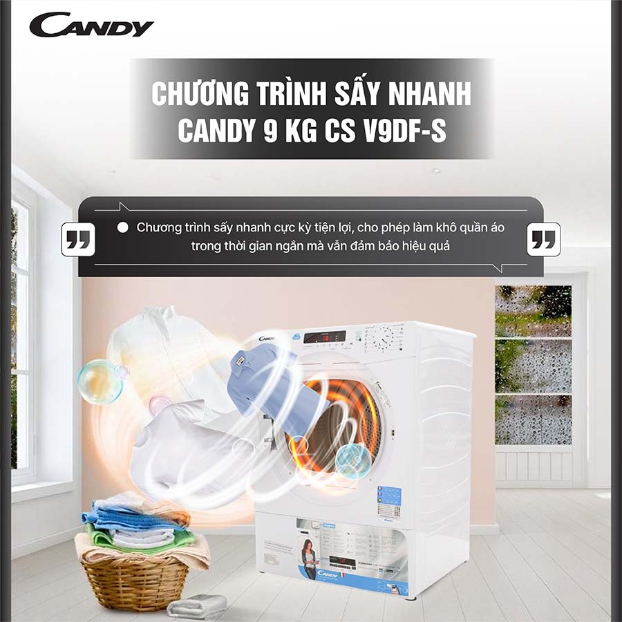 Không chỉ vậy, việc sấy một lần lượng lớn quần áo còn giúp tiết kiệm điện năng hiệu quả hơn so với việc sấy nhiều lần với máy nhỏ hơn. Nhờ đó, máy sấy Candy 9 kg không chỉ đáp ứng nhu cầu sử dụng đa dạng mà còn mang lại sự tiện lợi, kinh tế cho người dùng trong sinh hoạt hàng ngày.