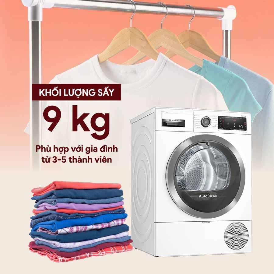 Trọng tải của máy lên tới 9kg quần áo nên bạn có thể thoải mái làm khô đồ dùng cho cả gia đình đông người hoặc sấy chăn, màn, những món đồ lớn, không có đủ diện tích phơi phóng. Mặc dù tải trọng lớn nhưng trong quá trình vận hành máy không hề rung lắc mạnh, tạo sự dễ chịu cho người dùng.