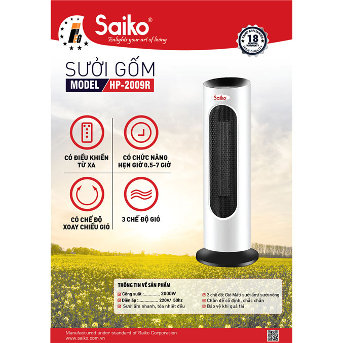 Máy sưởi gốm Ceramic Saiko CH 2009R ứng dụng công nghệ sưởi PTC mang lại hơi ấm cho gia đình bạn giữa mùa đông lạnh giá. Hơn nữa sợi sưởi Halogen đảm bảo không làm khô da, không đốt cháy oxy, bạn có thể lắp đặt thoải mái trong phòng ngủ của trẻ nhỏ, bà mẹ sau sinh, người già, người bệnh. Đây là thiết bị không thể thiếu trong mỗi căn hộ, hứa hẹn mang lại sự hài lòng tuyệt đối cho bạn. Còn bây giờ hãy theo chân Huy Trương khám phá thêm ưu điểm của sản phẩm này nhé.
