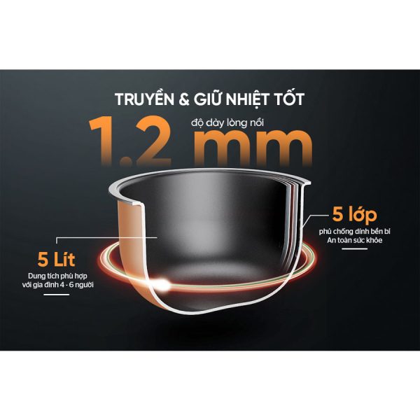- Lòng nồi 5 lớp phủ chống dính siêu bền, an toàn sức khỏe