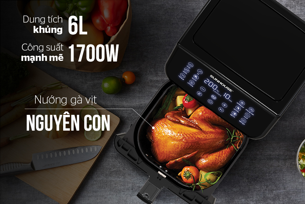 Nồi chiên không dầu 6L SUNHOUSE SHD4087 có kiểu dáng hiện đại với tone màu đen, bạc tối giản mà sang trọng, phù hợp với nhiều không gian nội thất khác nhau. Dung tích lớn 6L có thể nướng gà vịt nguyên con, chế biến các món ăn cầu kì.