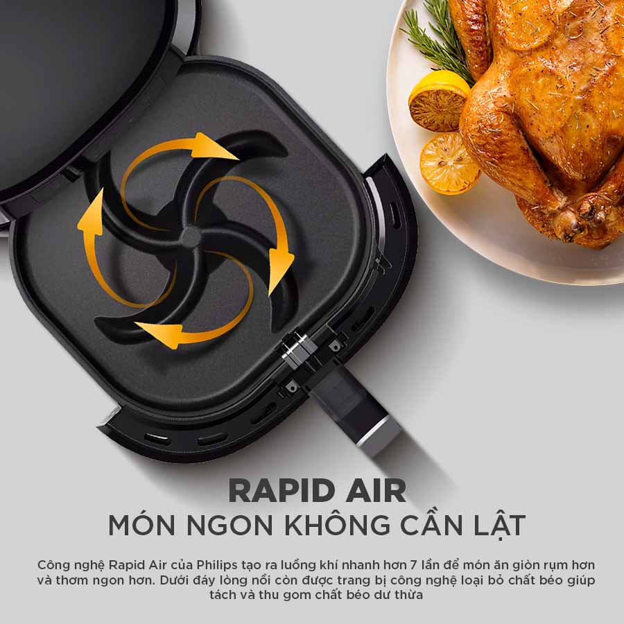 Công nghệ Rapid Air Technology, với thiết kế “hình sao” độc đáo, xoáy không khí nóng để tạo ra những món ăn ngon giòn bên ngoài và mềm bên trong, với rất ít dầu hoặc không cần dầu.