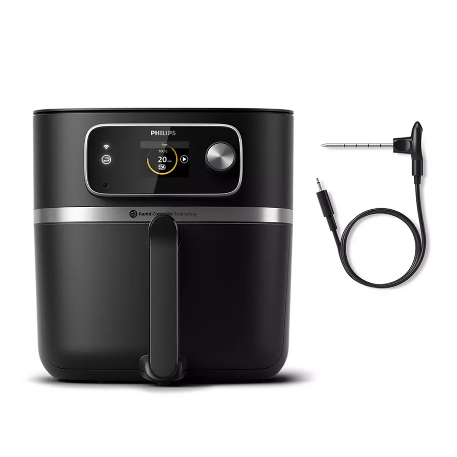Một trong những điểm nâng cấp đáng giá trên nồi chiên không dầu Philips HD9880/90 chính là nhiệt kế thực phẩm thông minh tích hợp. Thiết bị này cho phép người dùng kiểm soát chính xác độ chín của thực phẩm theo ý muốn từ tái, chín vừa cho đến chín kỹ mà không cần mở nắp kiểm tra thủ công trong quá trình nấu.
