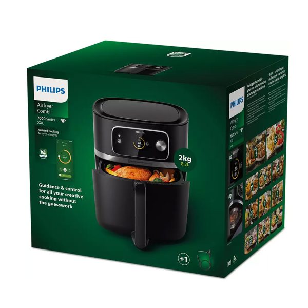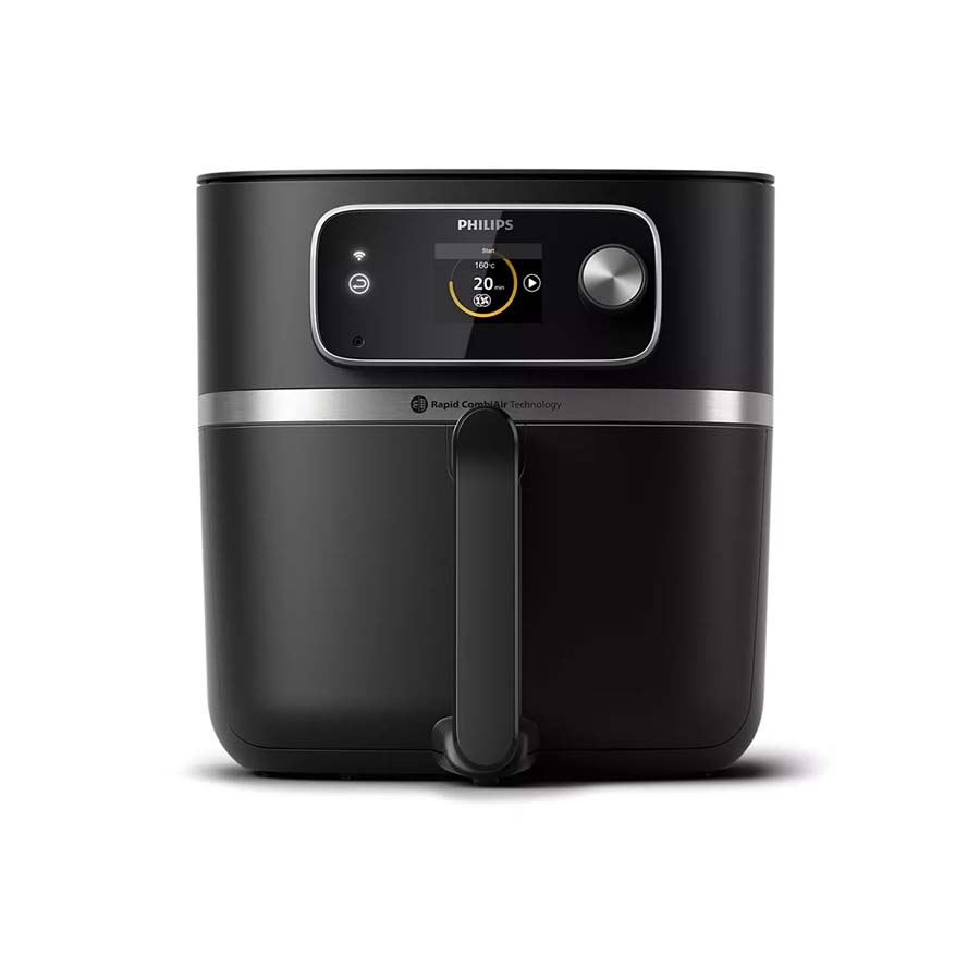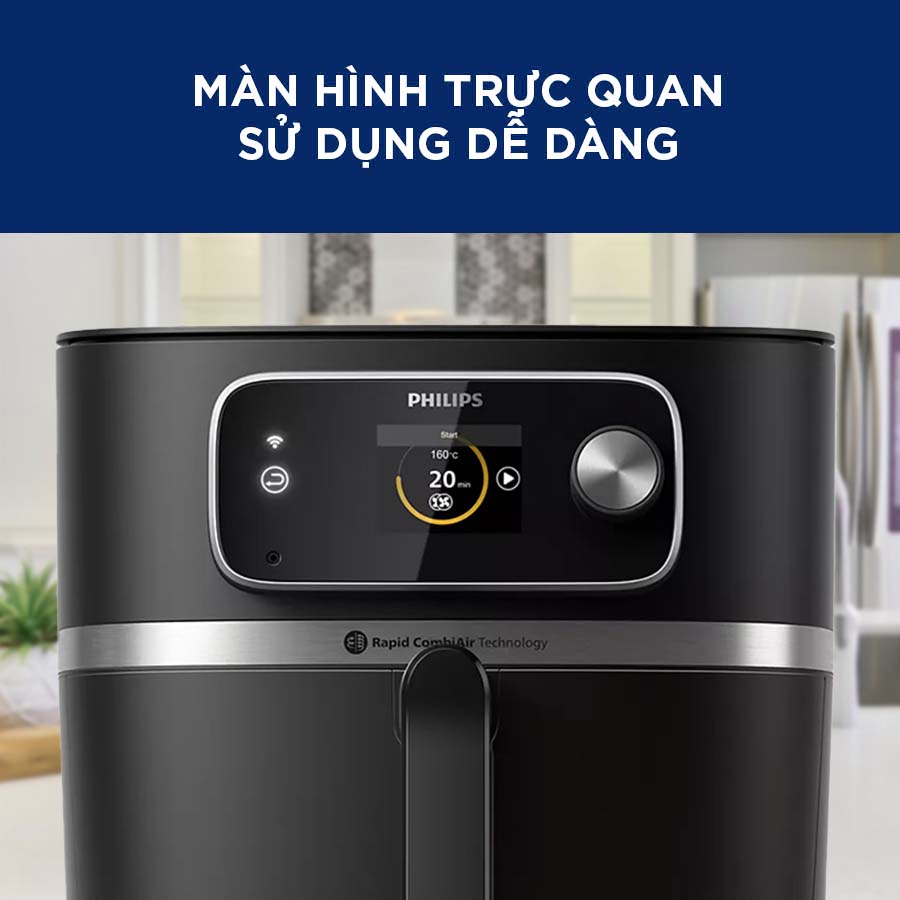 Nồi chiên không dầu Philips HD9880/90 8.3 lít được trang bị bảng điều khiển cảm ứng kết hợp nút xoay giúp điều chỉnh các chế độ nấu một cách trực quan. Tuy nhiên, điểm nổi bật hơn là sản phẩm có thể kết nối với ứng dụng NutriU trên điện thoại, giúp người dùng điều khiển và theo dõi quá trình nấu từ xa một cách tiện lợi.