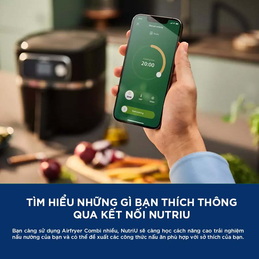 Nồi chiên không dầu Philips được trang bị khả năng kết nối với ứng dụng NutriU, mang lại trải nghiệm nấu nướng hiện đại và tiện lợi hơn cho người dùng. Ứng dụng này hiện chỉ hỗ trợ trên hệ điều hành iOS, giúp bạn dễ dàng kết nối và điều khiển nồi từ xa thông qua điện thoại.