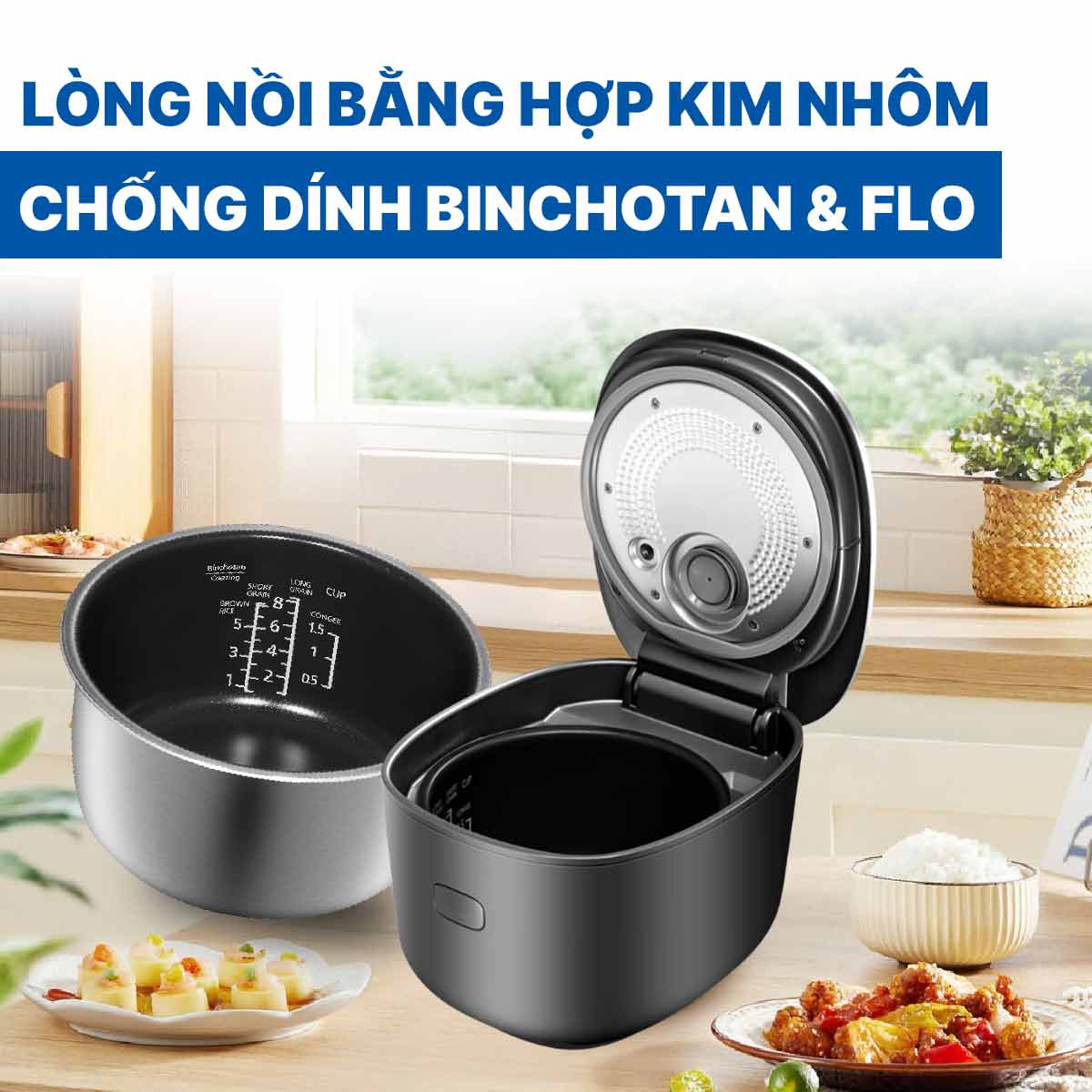 - Chất liệu lòng nồi: Hợp kim phủ chống dính