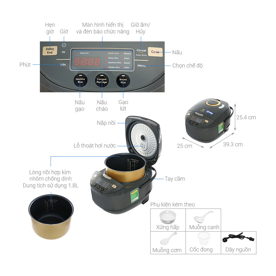 - Phụ kiện: Xửng hấp, muỗng múc canh, muỗng múc cơm
