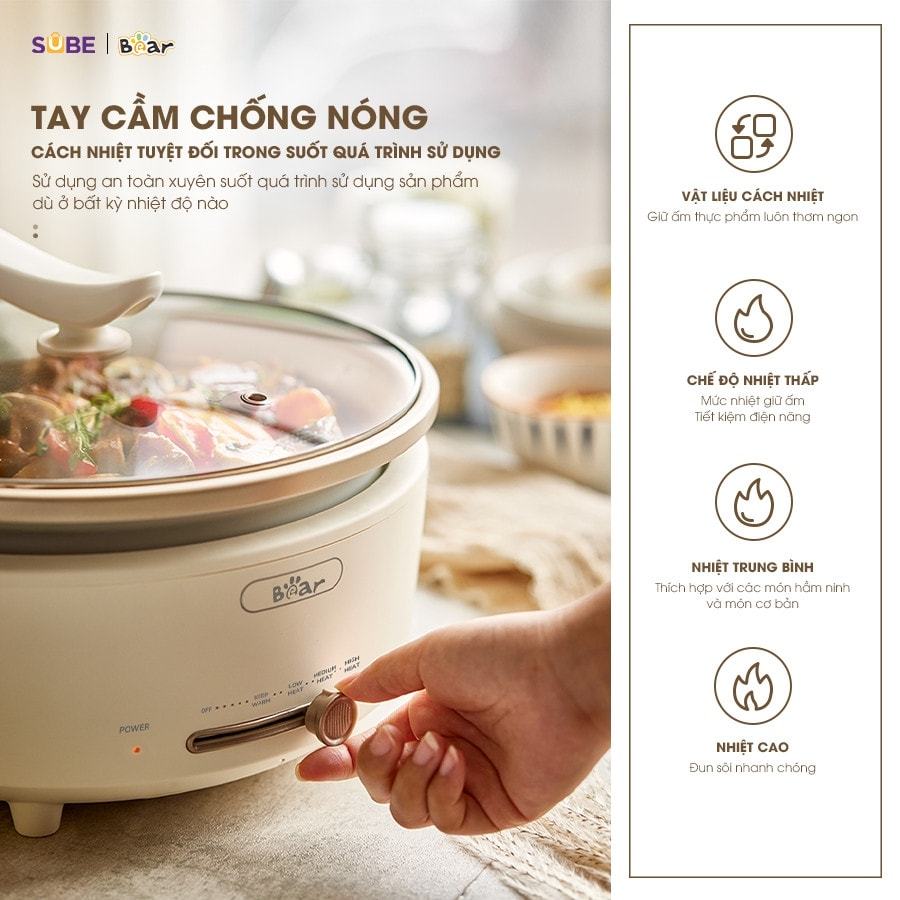 Không chỉ được lòng người tiêu dùng bởi chất liệu, chiếc nồi lẩu điện Bear này còn ghi điểm nhờ thiết kế đơn giản nhưng tinh tế, có 4 mức nhiệt (giữ ấm, lửa nhỏ, lửa vừa, lửa to) tích hợp ngay trên thân nồi, cho phép người dùng dễ dàng kiểm soát nhiệt lượng bằng thanh trượt.