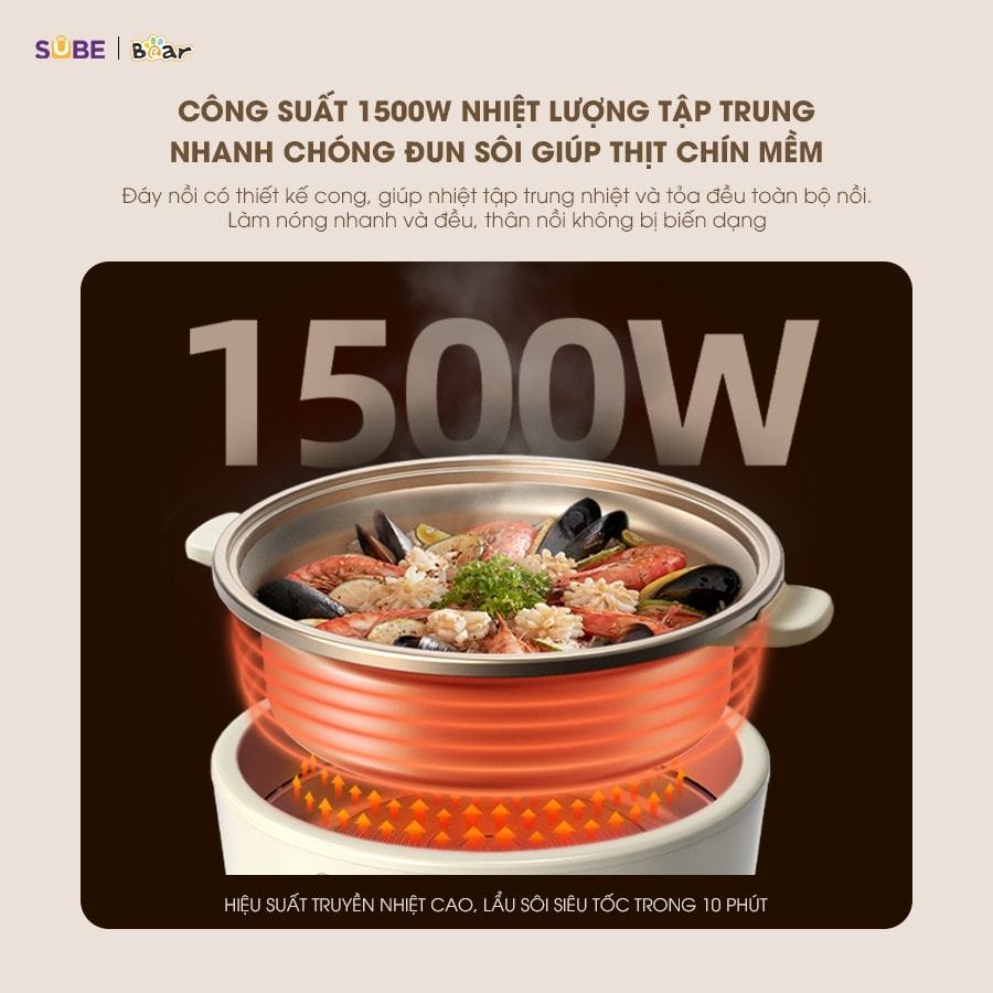 Nồi lẩu điện Bear 5L SB-NL05F có công suất tối đa là 1500W, hiệu suất truyền nhiệt cao, lẩu sôi siêu tốc chỉ trong vòng 10 phút, giúp người dùng tiết kiệm tối đa thời gian nấu ăn mà vẫn đảm bảo được chất lượng thực phẩm.