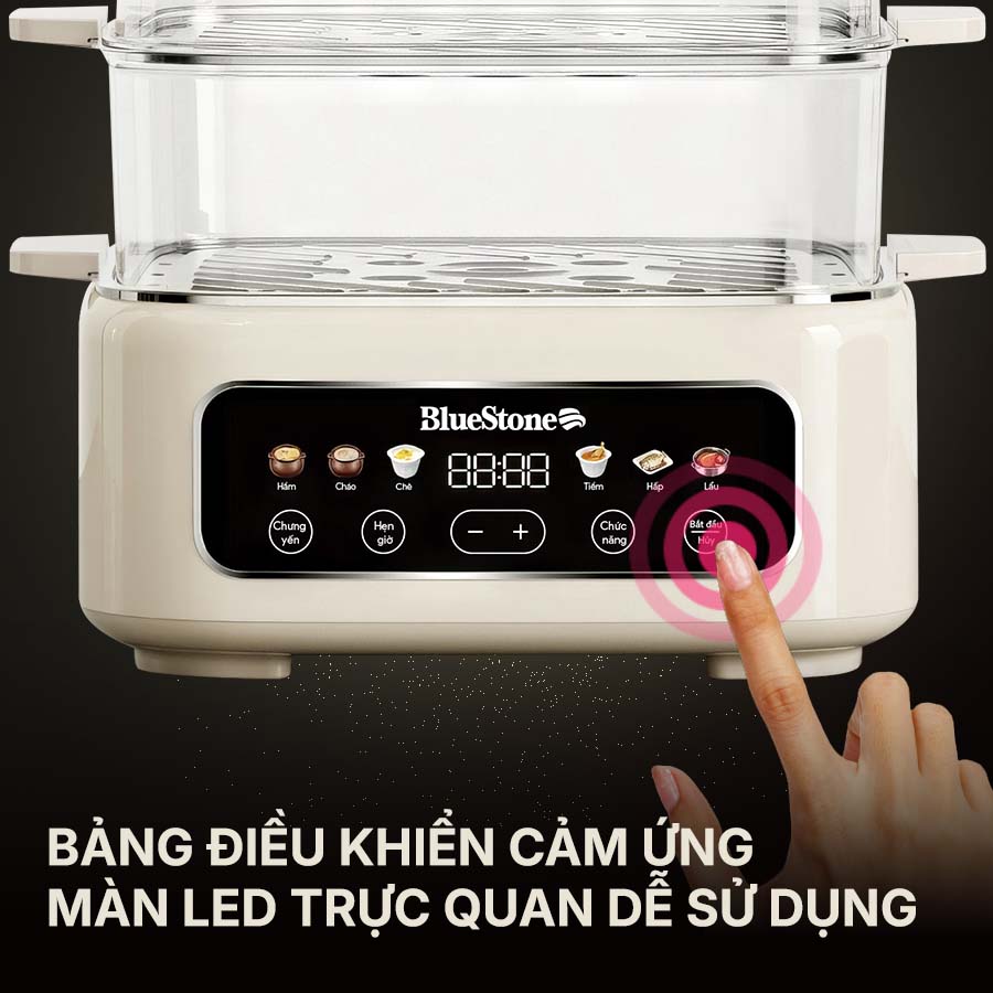 Nồi lẩu hấp điện đa năng BlueStone trang bị bảng điều khiển cảm ứng nhạy bén cùng màn hình điện tử hiển thị rõ nét, giúp người dùng quan sát và điều chỉnh các chức năng nấu một cách dễ dàng. Giao diện hiển thị tiếng Việt kết hợp với hình ảnh minh họa sinh động giúp mọi thao tác trở nên nhanh chóng, thuận tiện – kể cả với người lớn tuổi hay người lần đầu sử dụng, nâng cao trải nghiệm nấu nướng.