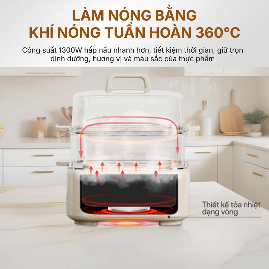 Nồi được thiết kế thông minh với xửng hấp kết hợp lòng nồi, đa dạng cách chế biến – từ hấp, nấu lẩu, luộc đến hâm nóng thực phẩm lành mạnh hơn, hạn chế dầu mỡ, chất béo có hại. Dung tích tổng lên tới 17L (12L cho xửng hấp và 5L cho lòng nồi), đặc biệt phù hợp với gia đình đông người hoặc các buổi họp mặt.