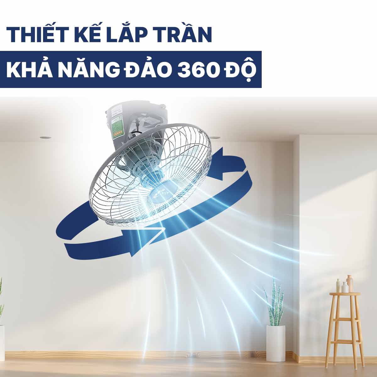 • Làm mát đều khắp không gian: Chức năng đảo 360 độ cho phép quạt phát gió theo nhiều hướng, đảm bảo lưu thông không khí đồng đều trong phòng. Điều này không chỉ cải thiện hiệu quả làm mát mà còn giúp duy trì nhiệt độ ổn định, tạo sự thoải mái cho người sử dụng.