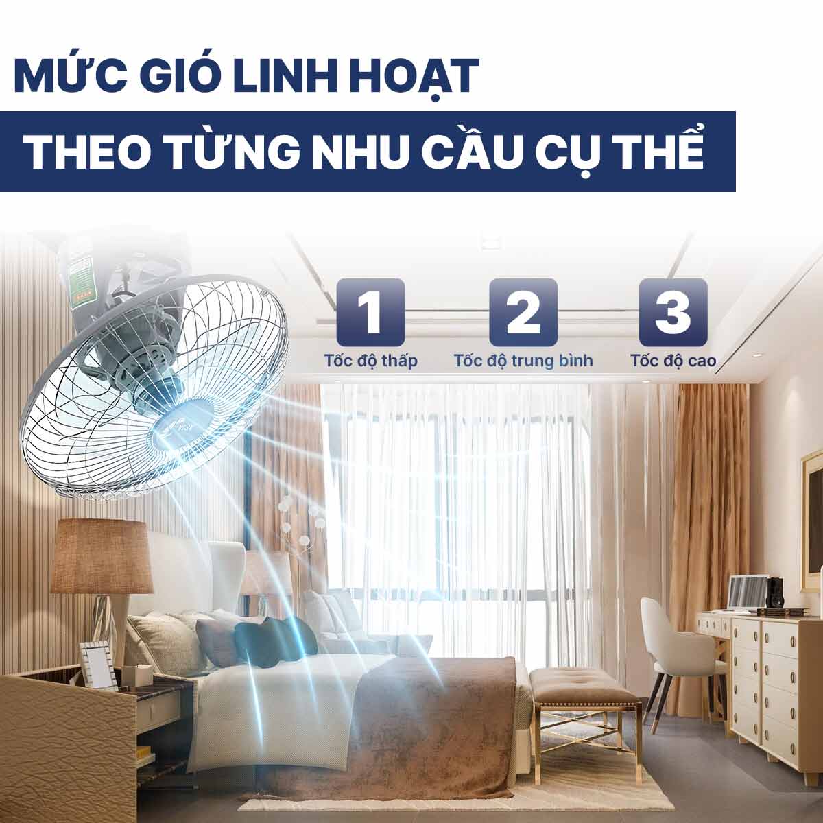 Quạt đảo trần được trang bị 3 tốc độ gió, tạo ra sự linh hoạt tối đa trong việc điều chỉnh lưu lượng gió theo từng nhu cầu cụ thể của người sử dụng.