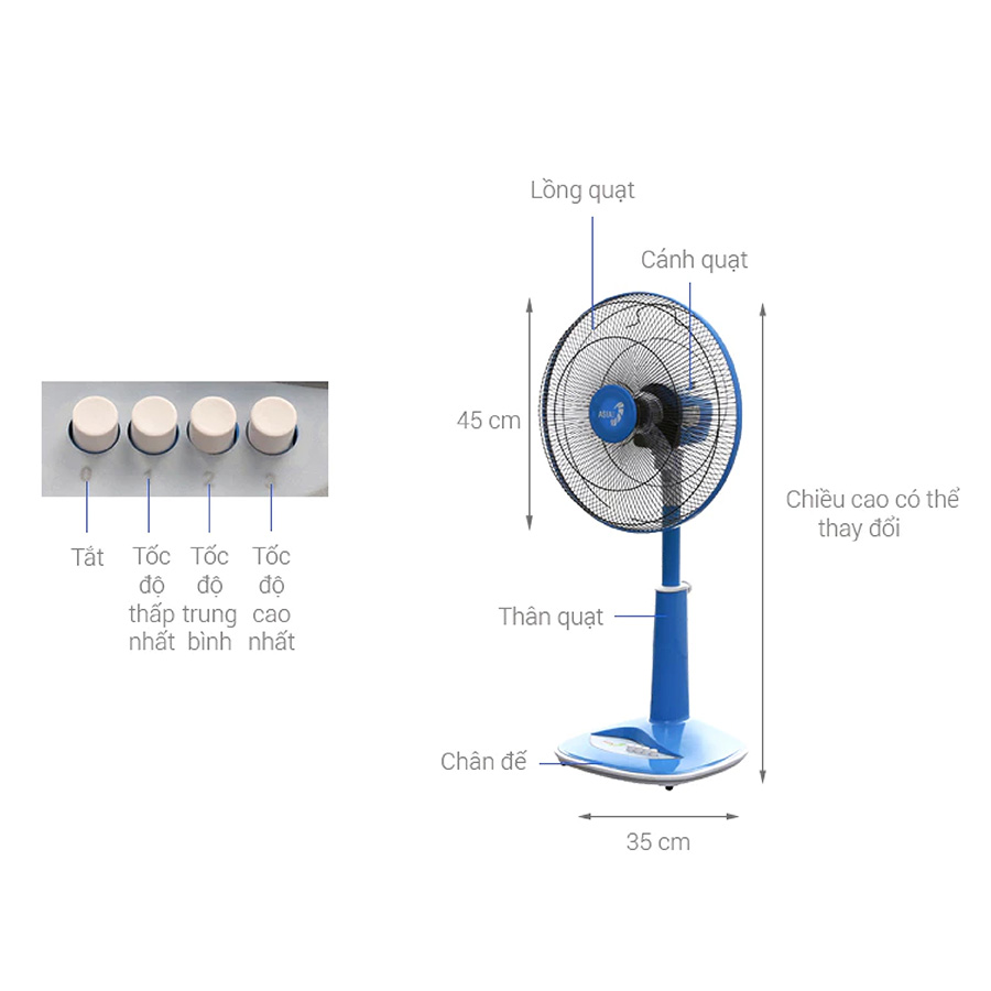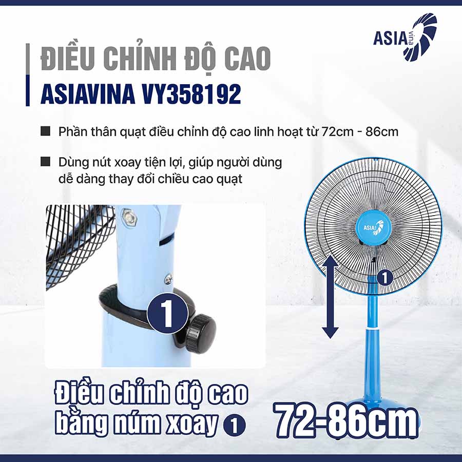 Quạt có thể điều chỉnh độ cao từ 72cm – 86cm thông qua nút xoay tiện lợi, cho phép người dùng linh hoạt thay đổi theo nhu cầu sử dụng. Nhờ đó, quạt có thể đặt ở nhiều vị trí khác nhau trong nhà, từ phòng khách, phòng ngủ đến phòng làm việc, giúp làm mát hiệu quả ở mọi không gian.
