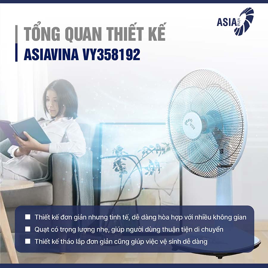 Quạt lửng Asiavina VY358192 sở hữu thiết kế đơn giản nhưng tinh tế, dễ dàng hòa hợp với nhiều không gian nội thất. Các chi tiết bên ngoài được làm từ chất liệu nhựa cao cấp, có độ bền cao, chống bám bụi và dễ dàng lau chùi, giúp quạt luôn sạch sẽ và sáng bóng theo thời gian. Ngoài ra, quạt có trọng lượng nhẹ, giúp người dùng thuận tiện trong việc di chuyển đến các vị trí khác nhau trong nhà. Thiết kế tháo lắp đơn giản cũng giúp việc vệ sinh cánh quạt, lồng quạt trở nên dễ dàng hơn, đảm bảo hiệu suất làm mát luôn ở mức tối ưu.