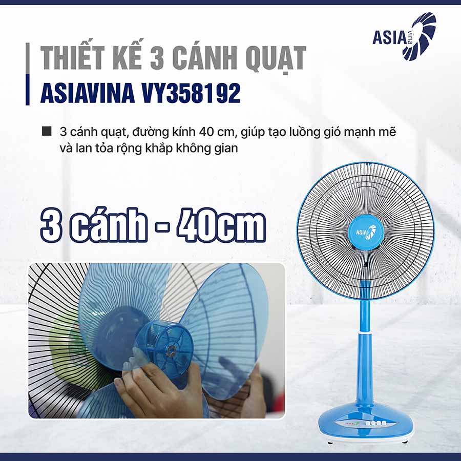 Với thiết kế 3 cánh quạt, đường kính 40 cm, giúp tạo luồng gió mạnh mẽ và lan tỏa rộng khắp không gian. Nhờ thiết kế này, quạt có khả năng làm mát nhanh chóng, mang lại cảm giác dễ chịu ngay cả trong những ngày thời tiết oi bức.