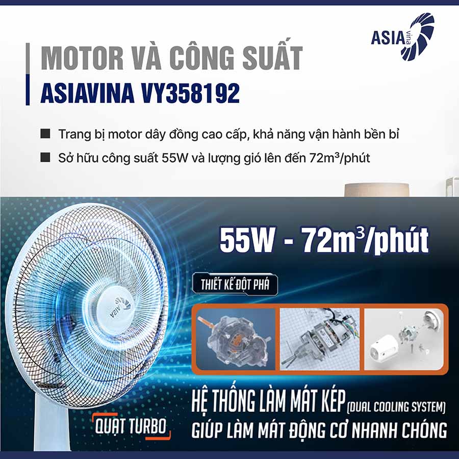 VY358192 được trang bị motor dây đồng cao cấp, đảm bảo khả năng vận hành bền bỉ và mạnh mẽ theo thời gian. Đặc biệt, quạt ứng dụng công nghệ Dual Cooling System (Công nghệ làm mát kép), giúp motor luôn được làm mát hiệu quả trong quá trình hoạt động. Hệ thống này không chỉ giúp giảm nhiệt độ động cơ, hạn chế tình trạng quá tải hay nóng máy khi sử dụng liên tục mà còn góp phần kéo dài tuổi thọ sản phẩm. Nhờ đó, quạt vận hành ổn định, ít hao mòn, mang đến trải nghiệm sử dụng an toàn và lâu dài cho người dùng.