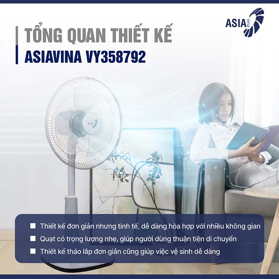 Quạt lửng Asiavina VY358792 sở hữu thiết kế đơn giản nhưng tinh tế, dễ dàng hòa hợp với nhiều không gian nội thất. Các chi tiết bên ngoài được làm từ chất liệu nhựa cao cấp, có độ bền cao, chống bám bụi và dễ dàng lau chùi, giúp quạt luôn sạch sẽ và sáng bóng theo thời gian. Ngoài ra, quạt có trọng lượng nhẹ, giúp người dùng thuận tiện trong việc di chuyển đến các vị trí khác nhau trong nhà. Thiết kế tháo lắp đơn giản cũng giúp việc vệ sinh cánh quạt, lồng quạt trở nên dễ dàng hơn, đảm bảo hiệu suất làm mát luôn ở mức tối ưu.