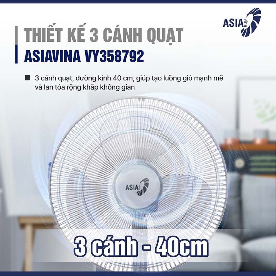 Với thiết kế 3 cánh quạt, đường kính 40 cm, giúp tạo luồng gió mạnh mẽ và lan tỏa rộng khắp không gian. Nhờ thiết kế này, quạt có khả năng làm mát nhanh chóng, mang lại cảm giác dễ chịu ngay cả trong những ngày thời tiết oi bức.