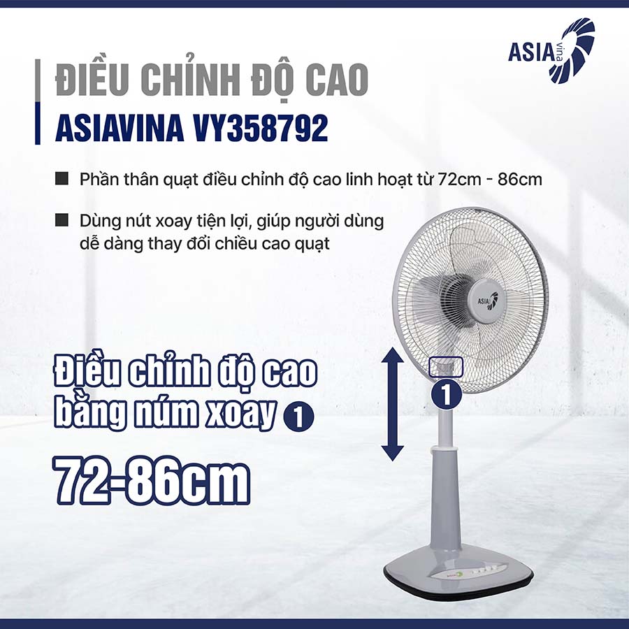 Quạt có thể điều chỉnh độ cao từ 72cm – 86cm thông qua nút xoay tiện lợi, cho phép người dùng linh hoạt thay đổi theo nhu cầu sử dụng. Nhờ đó, quạt có thể đặt ở nhiều vị trí khác nhau trong nhà, từ phòng khách, phòng ngủ đến phòng làm việc, giúp làm mát hiệu quả ở mọi không gian.
