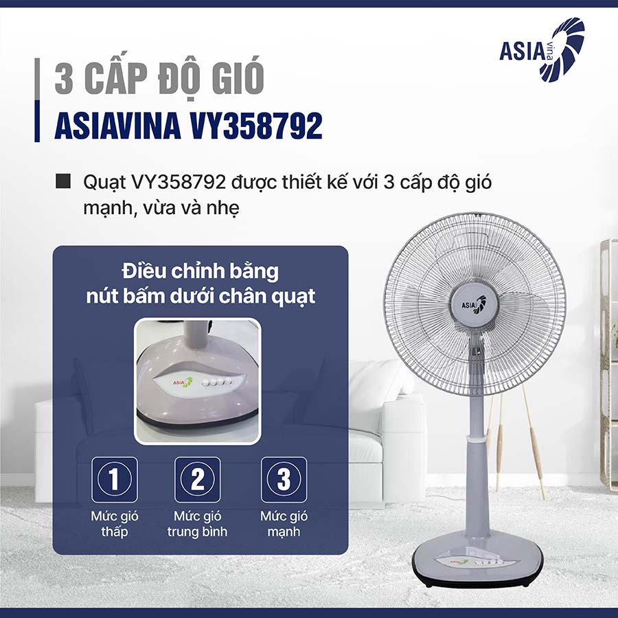 Quạt lửng VY358792 được trang bị công tắc điều chỉnh với 3 mức tốc độ gió khác nhau: mạnh, vừa và nhẹ. Điều này mang lại sự linh hoạt cho người dùng, giúp họ dễ dàng lựa chọn mức gió phù hợp với nhu cầu và điều kiện thời tiết.