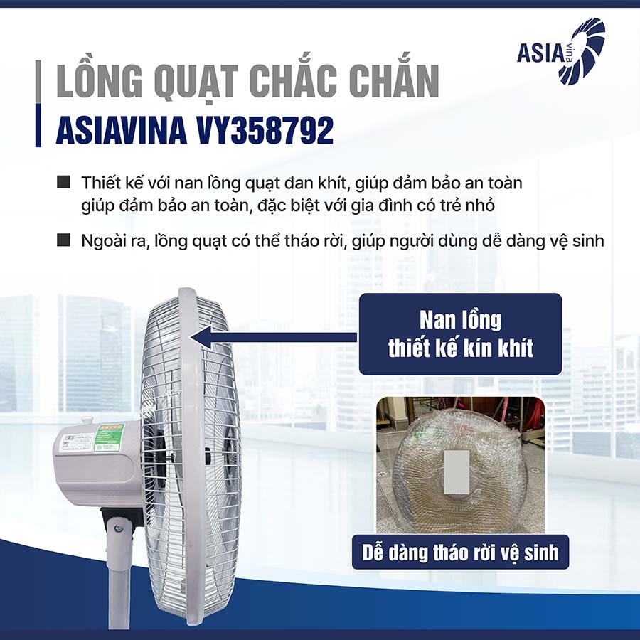 Quạt lửng VY358792 được thiết kế với nan lồng quạt đan khít, giúp đảm bảo an toàn, đặc biệt với gia đình có trẻ nhỏ. Nhờ thiết kế này, trẻ em không thể đưa tay vào cánh quạt khi quạt đang hoạt động, giảm thiểu nguy cơ tai nạn. Ngoài ra, lồng quạt có thể tháo rời, giúp người dùng dễ dàng vệ sinh và lau chùi, đảm bảo thiết bị luôn sạch sẽ và hoạt động ổn định theo thời gian.