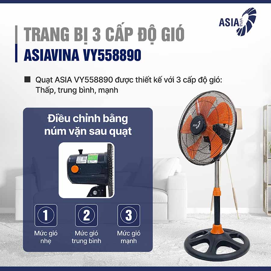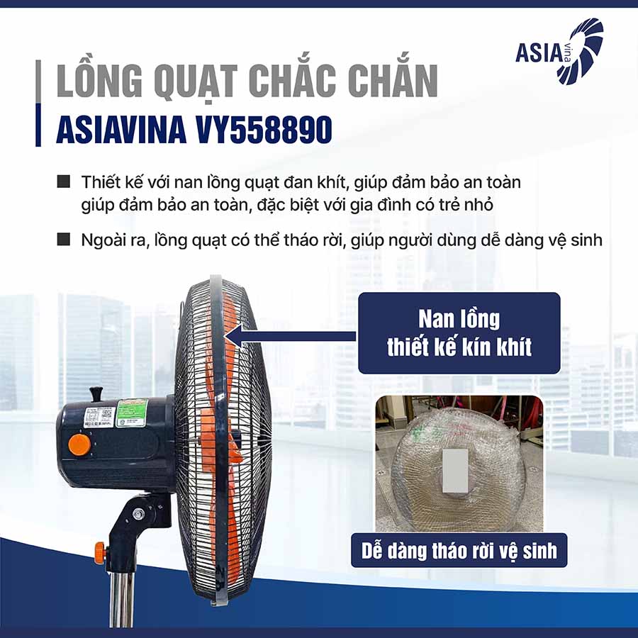Quạt lửng bán công nghiệp Asiavina VY558890 không chỉ mang đến khả năng làm mát mạnh mẽ mà còn sở hữu thiết kế tối ưu cho trải nghiệm sử dụng tiện lợi và an toàn.