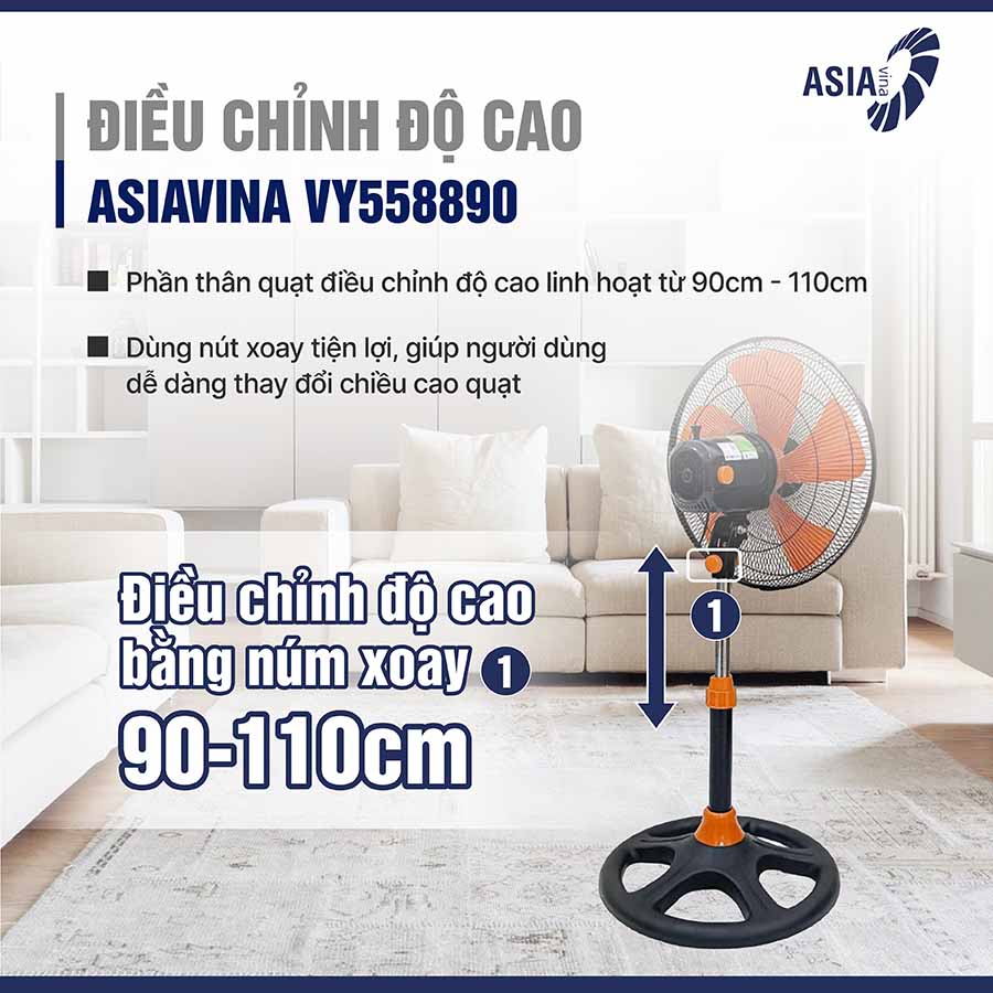 Quạt cho phép điều chỉnh chiều cao linh hoạt, giúp người dùng dễ dàng thay đổi độ cao sao cho phù hợp với từng vị trí sử dụng. Dù cần làm mát toàn bộ căn phòng hay tập trung vào một khu vực nhất định, VY558890 đều có thể đáp ứng tốt.