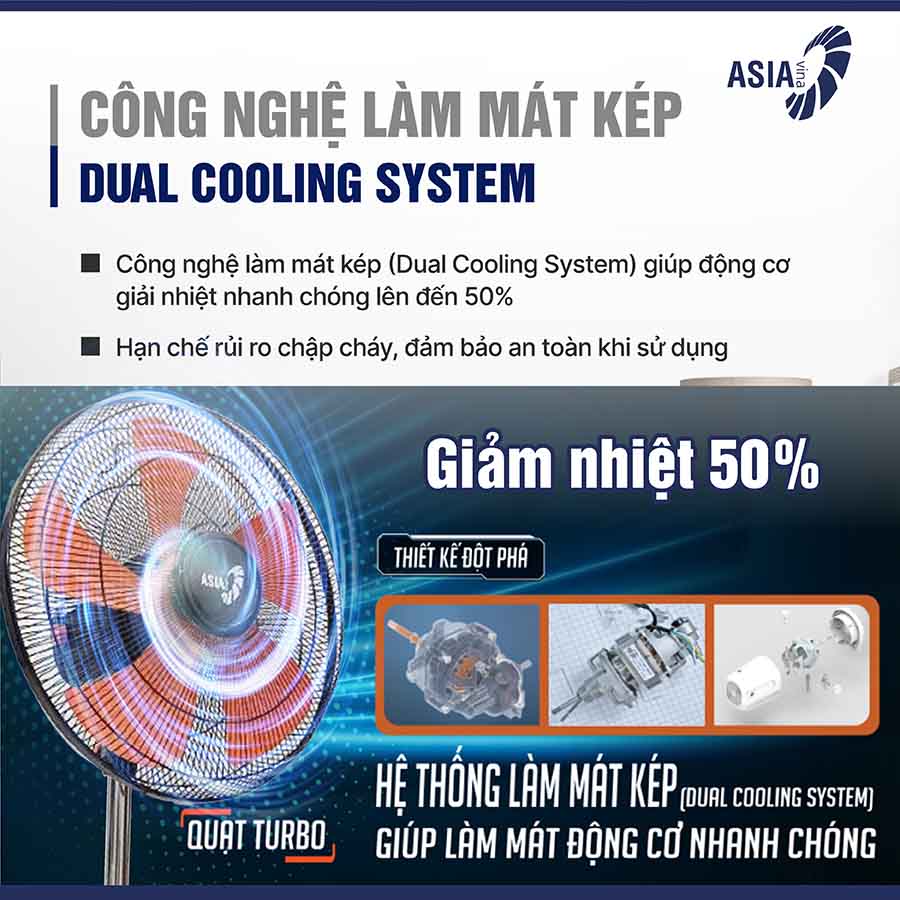 Quạt lửng Asiavina VY558890 được trang bị công nghệ Dual Cooling System (hệ thống làm mát kép) giúp giảm nhiệt động cơ lên đến 50%, hạn chế tình trạng quá tải khi quạt hoạt động trong thời gian dài. Điều này không chỉ giúp quạt vận hành ổn định mà còn tăng độ bền, kéo dài tuổi thọ động cơ, mang lại sự an tâm cho người dùng.