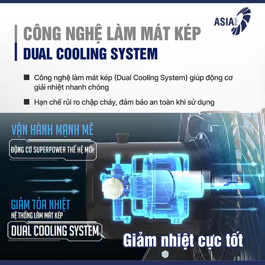 Công nghệ làm mát kép Dual Cooling System trên quạt sàn Asiavina Turbo Plus VY636092 là một cải tiến quan trọng giúp tăng hiệu suất hoạt động của motor và kéo dài tuổi thọ thiết bị. Hệ thống này có khả năng giảm nhiệt đến 50%, đảm bảo motor luôn vận hành ổn định mà không bị quá nóng khi hoạt động trong thời gian dài. Nhờ vậy, quạt không chỉ duy trì sức gió mạnh mẽ mà còn hạn chế tình trạng quá tải, giúp thiết bị bền bỉ hơn theo thời gian. Ngoài ra, công nghệ này còn góp phần tạo ra luồng không khí mát mẻ và liên tục, giúp không gian trong gia đình luôn thông thoáng, dễ chịu, đặc biệt là trong những ngày thời tiết oi bức.