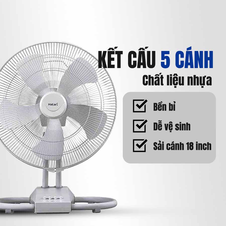 Để tối ưu hóa hiệu quả làm mát, quạt còn được trang bị cánh quạt có sải cánh rộng 18 inch. Với kích thước này, quạt có thể tạo ra lưu lượng gió lớn hơn so với các loại quạt có sải cánh nhỏ hơn. Thiết kế 5 cánh quạt cũng đóng một vai trò quan trọng trong việc tạo ra luồng gió đều và mạnh mẽ. Các cánh quạt được thiết kế với hình dạng và góc nghiêng tối ưu, giúp cắt gió hiệu quả và đẩy gió đi xa hơn trong không gian. Sự kết hợp hoàn hảo giữa công suất mạnh mẽ và thiết kế cánh quạt thông minh giúp Hatari IT18M2 trở thành một giải pháp làm mát lý tưởng cho mọi không gian.
