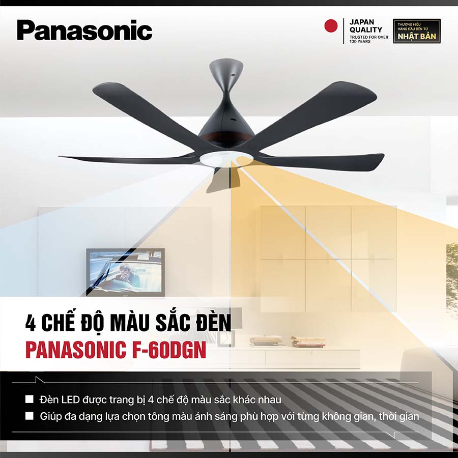 Điểm nổi bật của đèn LED trên quạt trần F-60DGN là khả năng thay đổi 4 chế độ màu sắc khác nhau. Điều này giúp người dùng dễ dàng lựa chọn tông màu ánh sáng phù hợp với từng thời điểm trong ngày hoặc theo nhu cầu sử dụng, từ ánh sáng ấm áp tạo cảm giác thư giãn đến ánh sáng trắng rõ nét giúp tập trung làm việc.