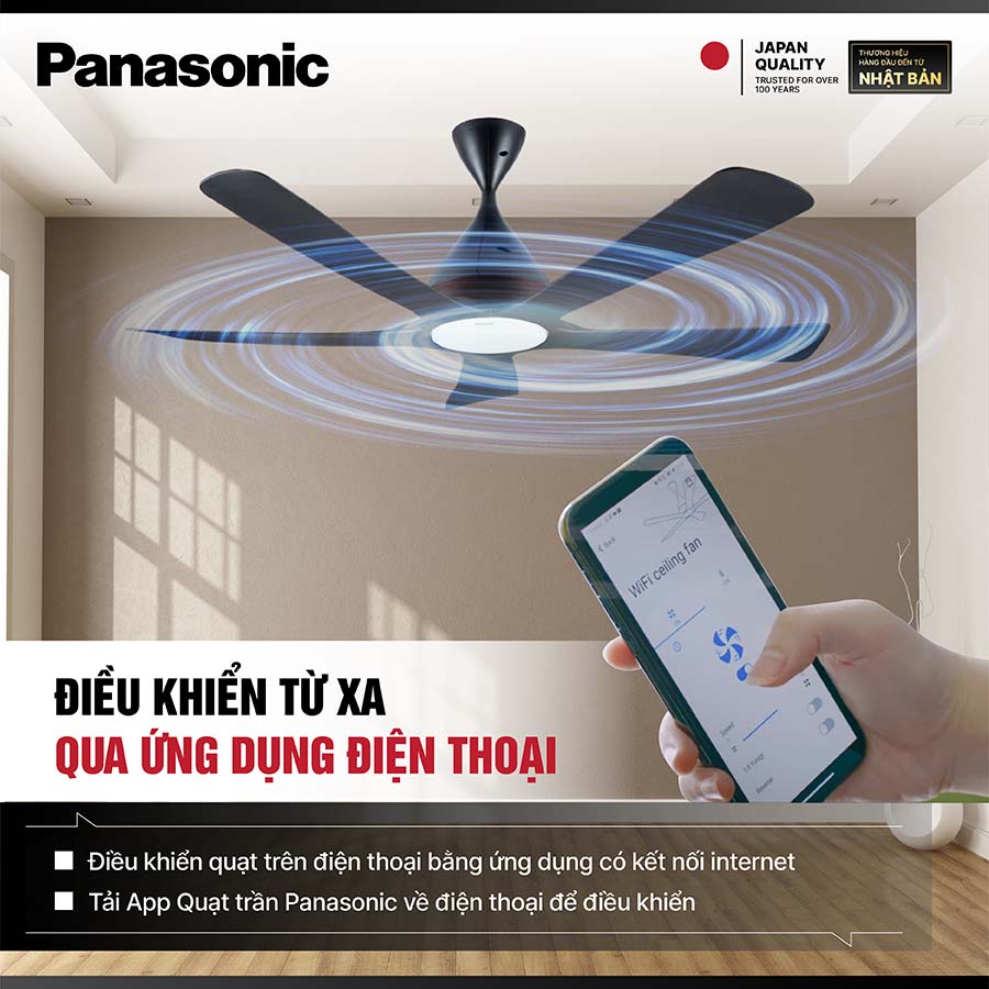 Tính năng điều khiển thông minh qua ứng dụng di động, giúp người dùng có thể bật/tắt quạt, điều chỉnh tốc độ gió, cài đặt hẹn giờ từ xa một cách dễ dàng. Chỉ cần kết nối quạt với Wifi, bạn có thể kiểm soát quạt từ bất kỳ đâu thông qua ứng dụng quạt trần Panasonic trên smartphone. Điều này đặc biệt tiện lợi khi bạn đang nằm thư giãn trên giường, ngồi làm việc hoặc đi vắng nhưng vẫn muốn kiểm soát không gian mát mẻ trong nhà.