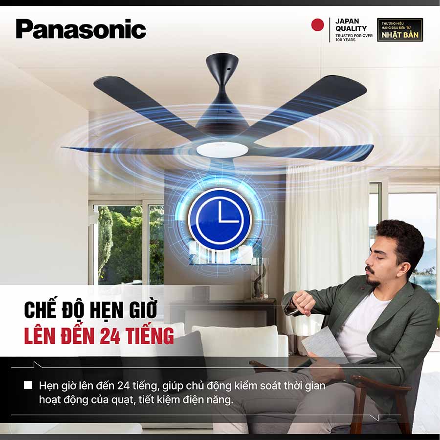 Quạt trần Panasonic F-60DGN được trang bị chế độ hẹn giờ lên đến 24 tiếng, giúp người dùng chủ động kiểm soát thời gian hoạt động theo nhu cầu cá nhân. Bạn có thể dễ dàng thiết lập thời gian bật/tắt quạt thông qua remote điều khiển từ xa, mang lại sự thuận tiện tối đa trong quá trình sử dụng.