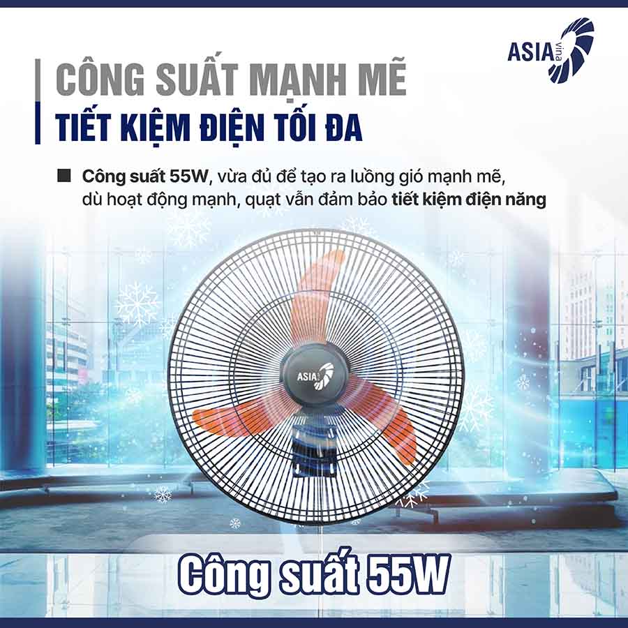 ASIAVINA VY557990 có công suất 55W, một mức công suất vừa đủ để tạo ra luồng gió mạnh mẽ, làm mát hiệu quả trong không gian lớn. Tuy nhiên, dù hoạt động mạnh, quạt vẫn đảm bảo tiết kiệm điện năng, giúp người dùng giảm chi phí vận hành lâu dài.