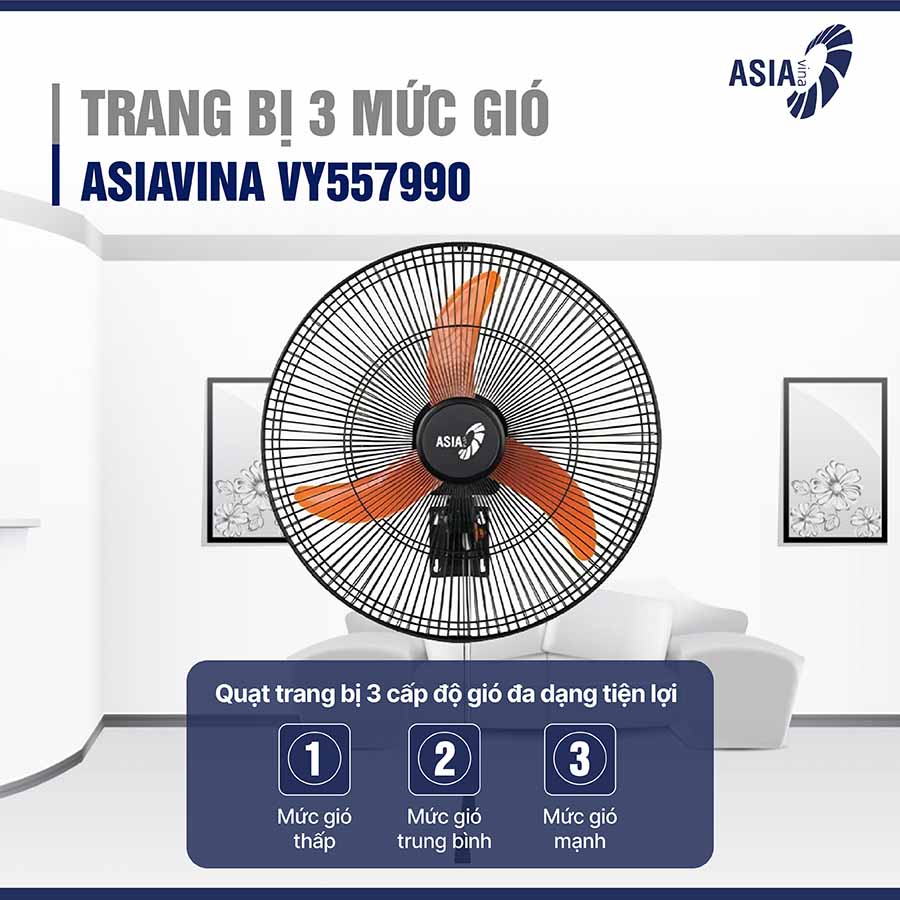 Quạt treo tường ASIAVINA VY557990 được trang bị 3 mức tốc độ gió, cho phép người dùng dễ dàng lựa chọn chế độ phù hợp với từng điều kiện thời tiết và nhu cầu sử dụng: