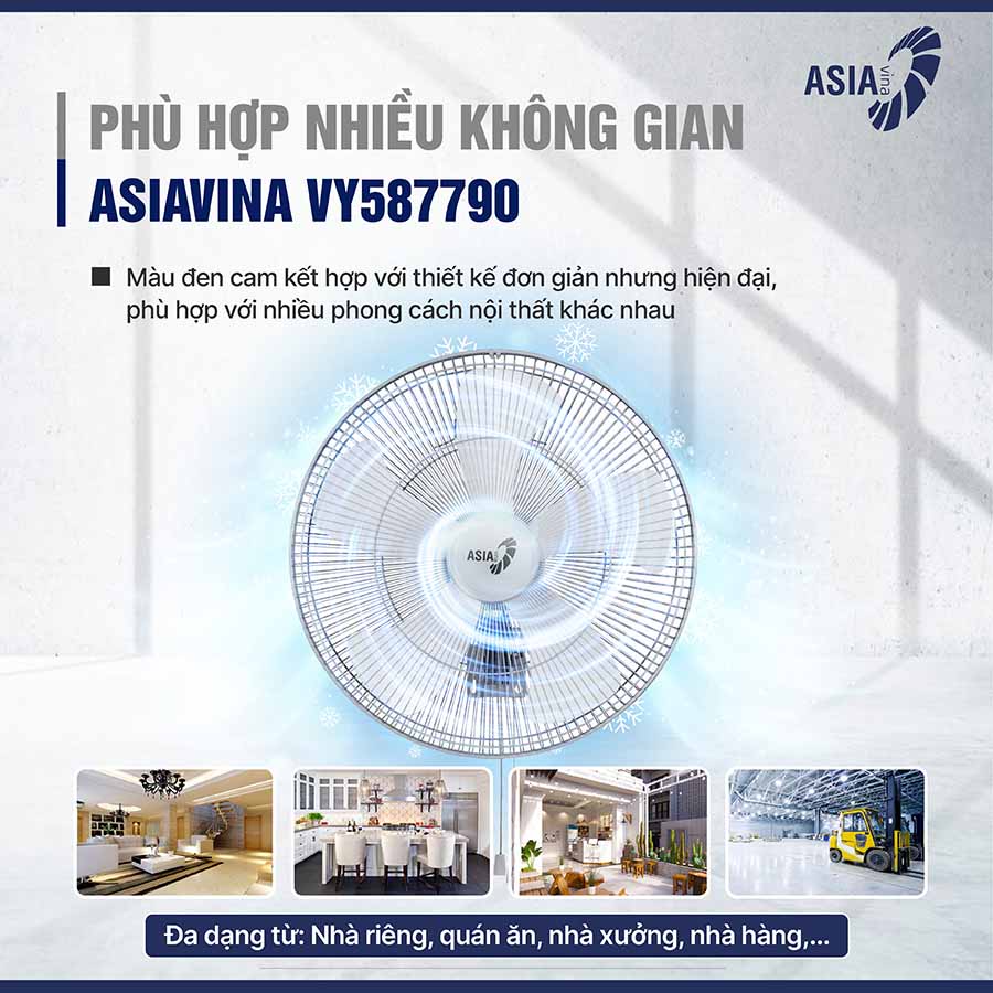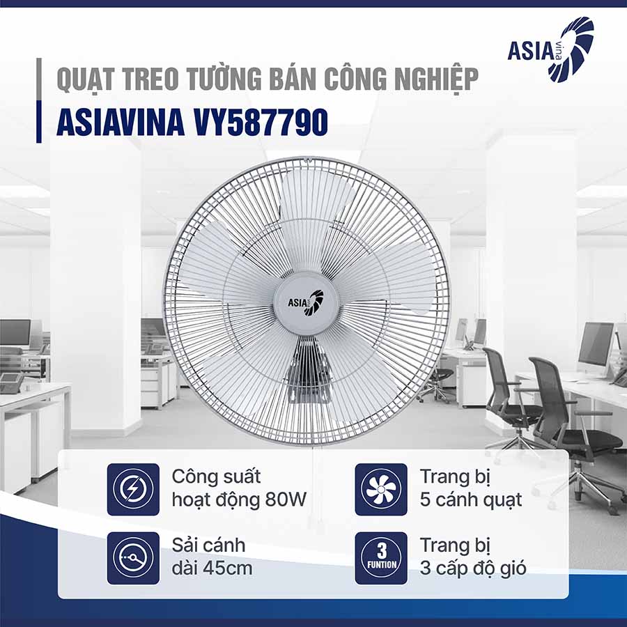 Quạt treo tường bán công nghiệp Asiavina VY587790 là sản phẩm mạnh mẽ, bền bỉ, phù hợp với không gian lớn và đây chắc chắn là giải pháp làm mát hiệu quả, tối ưu.