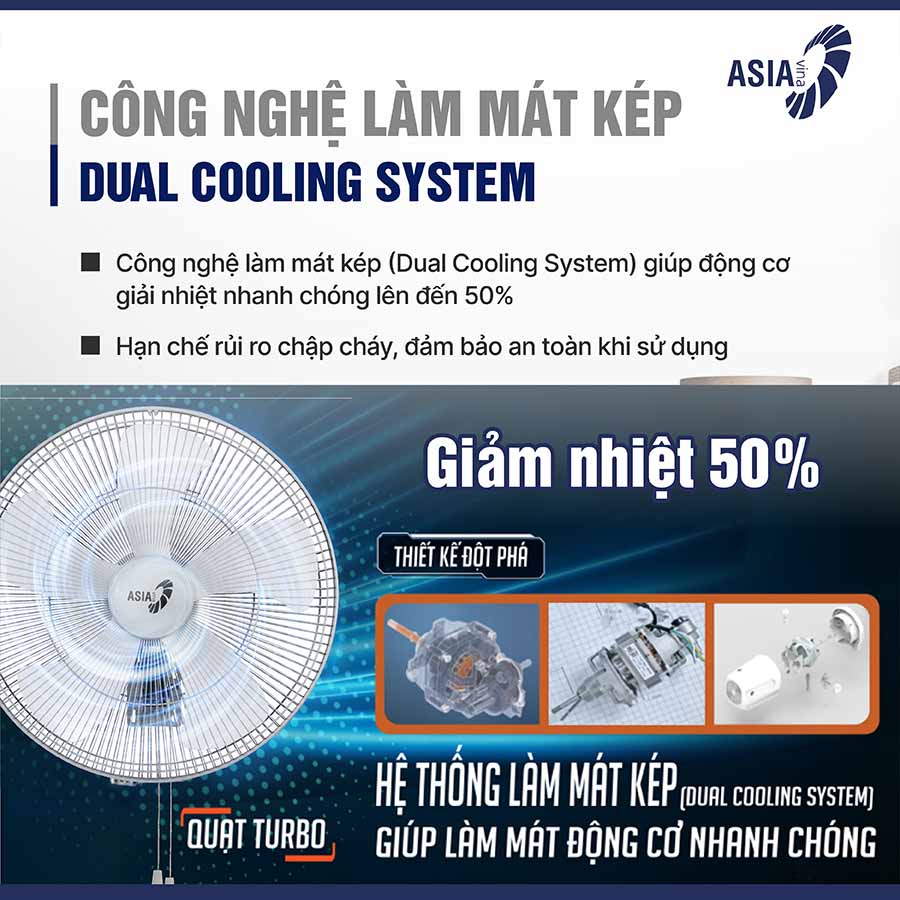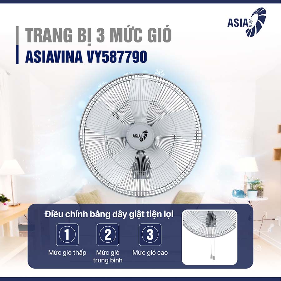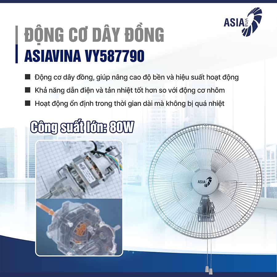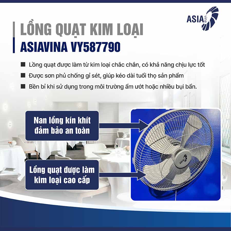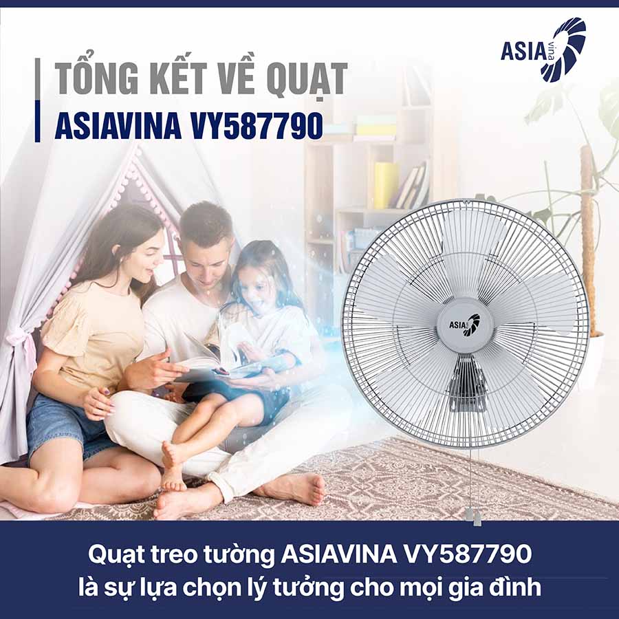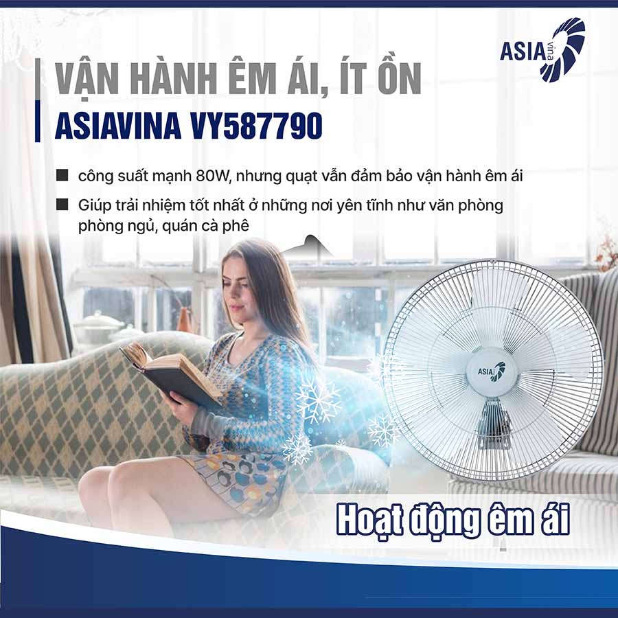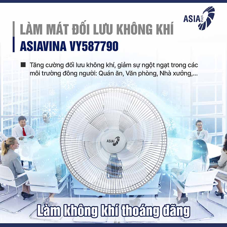 Với khả năng tỏa gió mạnh, lan tỏa đều, ASIAVINA VY587790 không chỉ mang đến sự mát mẻ mà còn giúp cải thiện chất lượng không khí, hạn chế tình trạng nóng bức, ngột ngạt trong những khu vực có đông người hoặc diện tích lớn.