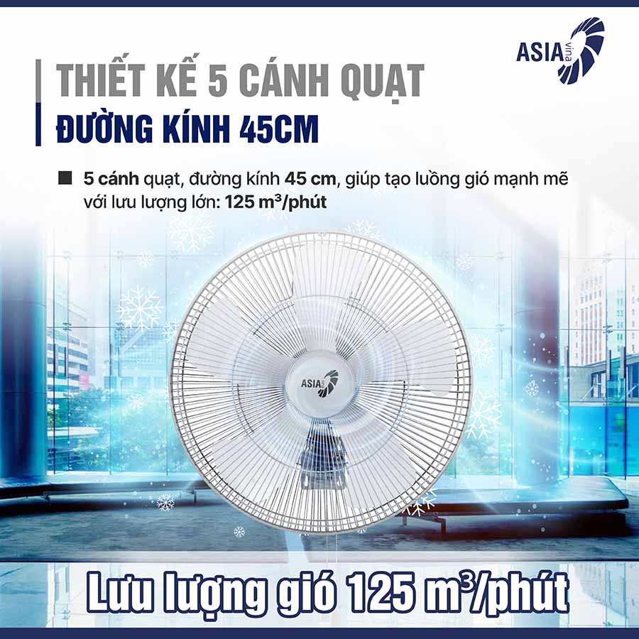 Nhờ công suất mạnh mẽ 80W, thiết kế sải cánh lớn 45 cm và lưu lượng gió 125 m³/phút, quạt treo tường bán công nghiệp Asiavina VY587790 là lựa chọn lý tưởng cho những không gian rộng, cần đối lưu không khí hiệu quả.