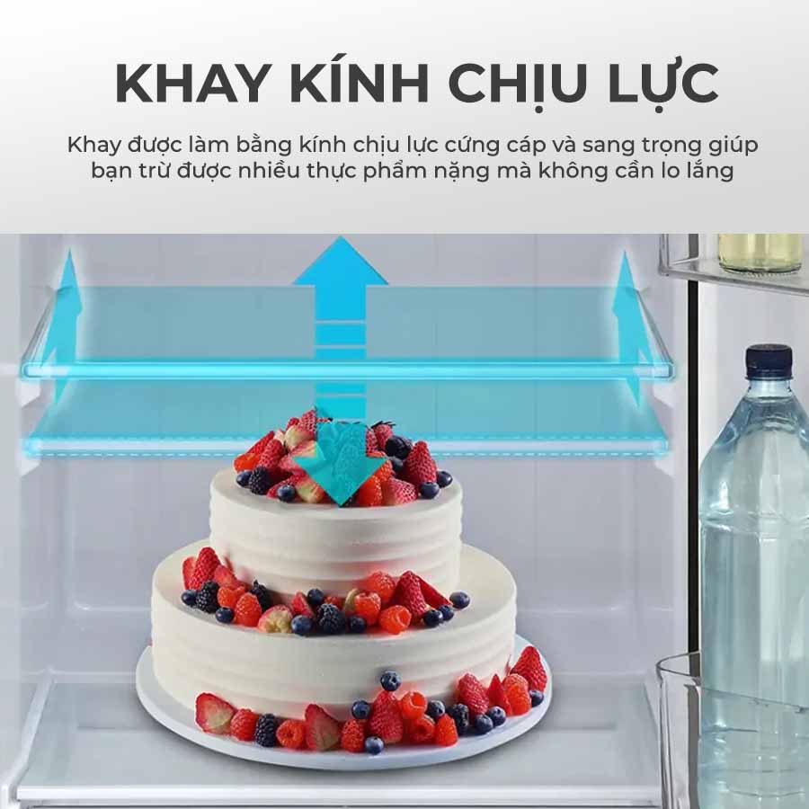 Các khay của tủ được làm từ chất liệu kính cường lực để bạn an tâm bảo quản thực phẩm khối lượng lớn (tối đa 120kg).