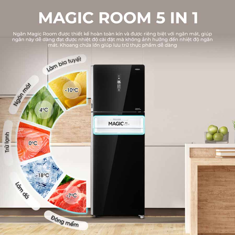 Tủ lạnh AQUA với nhiều ngăn chứa được thiết kế phù hợp với từng loại thực phẩm khác nhau giúp hạn chế bám mùi lẫn nhau. Ngăn Magic Room được thiết kế hoàn toàn kín và riêng biệt với ngăn mát, bạn có thể tự điều chỉnh nhiệt độ từ -18 độ đến 5 độ tùy theo mục đích sử dụng của từng loại thực phẩm.
