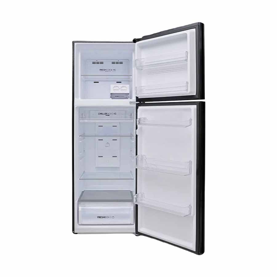 - Thiết kế kiểu tủ 2 cửa, ngăn đá trên, dung tích 328 lít phù hợp gia đình 3 – 4 thành viên.