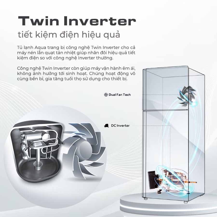 Tủ lạnh Aqua trang bị công nghệ Twin Inverter cho cả máy nén lẫn quạt tản nhiệt giúp nhân đôi hiệu quả tiết kiệm điện so với công nghệ Inverter thường.