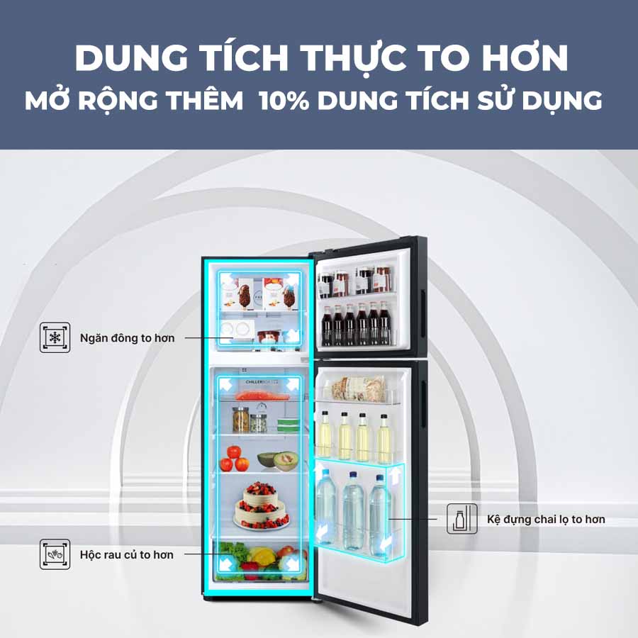 Tủ lạnh Aqua Inverter 333 lít AQR-T352FA(FB) cho không gian chứa thực phẩm rộng hơn đến 10% so với những chiếc tủ lạnh có cùng kích cỡ. Điều này đạt được nhờ vào thiết kế viền tủ mỏng, tăng diện tích lưu trữ bên trong mà không làm tăng kích thước bề ngoài. Nhờ đó, bạn tiết kiệm không gian lắp đặt, tạo ra khoảng trống cho sắp xếp các vật dụng khác. Kệ đựng chai lọ trên cánh tủ cũng được thiết kế sâu hơn, tạo điều kiện thuận lợi cho việc lưu trữ các chai lọ cao lớn.