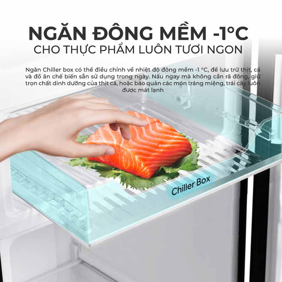 Ngăn Chiller Box cho phép người sử dụng điều chỉnh nhiệt độ xuống mức đông mềm -1℃ để bảo quản thịt cá và đồ ăn chế biến sẵn. Nhiệt độ này giúp thịt cá giữ được độ tươi ngon mà không cần cấp đông cứng hoàn toàn như bỏ vào ngăn đá. Bạn có thể cắt, thái, và tẩm ướp thịt cá ngay khi vừa lấy ra khỏi tủ lạnh để nấu những bữa ăn ngon nhanh chóng, tiết kiệm thời gian chuẩn bị.